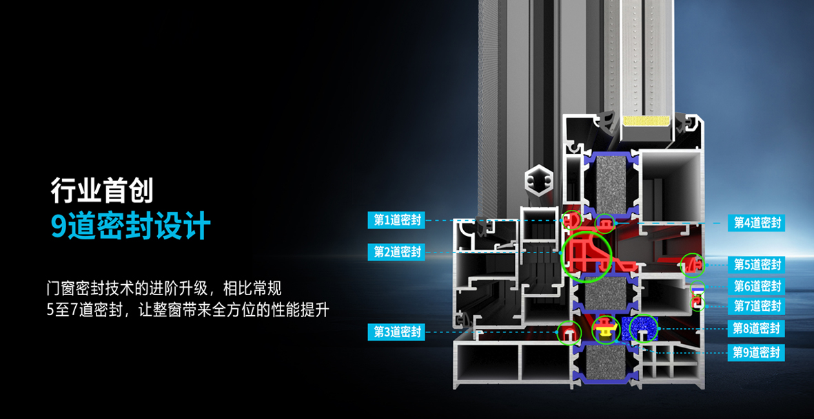 第一是密封道数,优选9道密封的机构,主副框之间一定要有独立防水密封设计,目前市面上罗马贵族新空间115沿海系统窗基本达到这类标准;