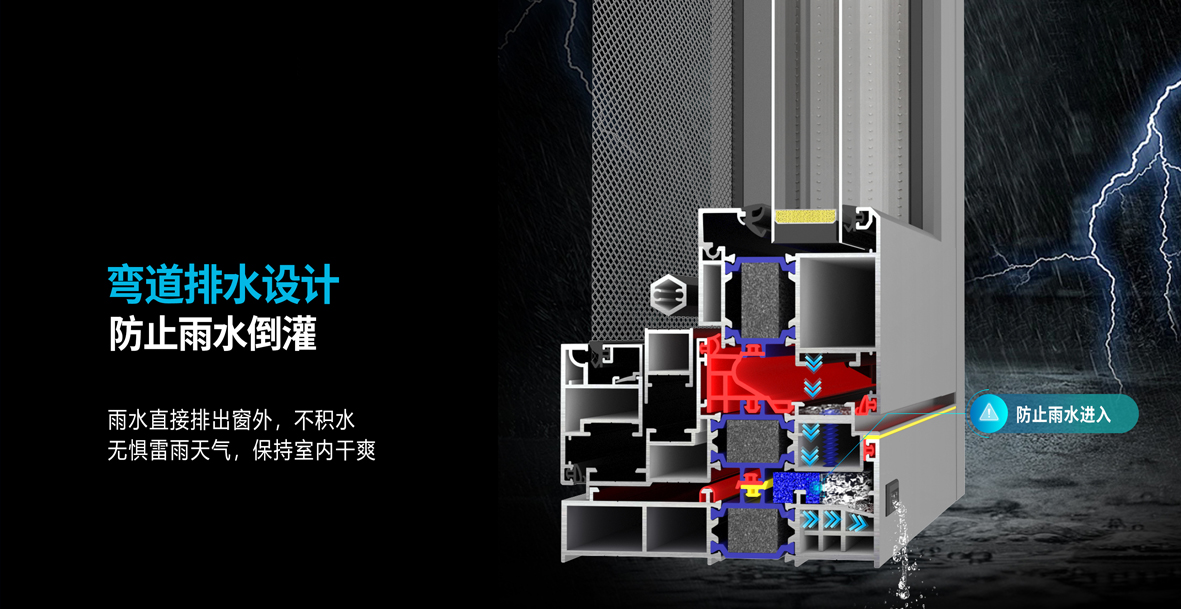 光有密封还不够,沿海门窗的排水逻辑也得跟上:普通内陆系统窗的直排式排水,遇到台风天很容易出现雨水倒灌,而新空间115沿海系统专门采用弯道排水专利技术,利用“阶梯式+斜面”的排水原理,就算室外风压再大,雨水也能顺利排出,不会堵在型材腔体里。